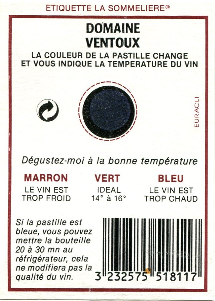 Une des premières est l’étiquette « La Sommelière® » fabriquée dans les années 1990 par la société EURACLI dans la Drôme. La formulation de l’encre était adaptée à chaque vin : la couleur verte indiquait la température idéale de dégustation, la couleur bleue une température trop élevée et la couleur brune une température trop basse. En voici un exemple de démonstration pour un vin rouge, à servir entre 16° et 18° (à gauche) :