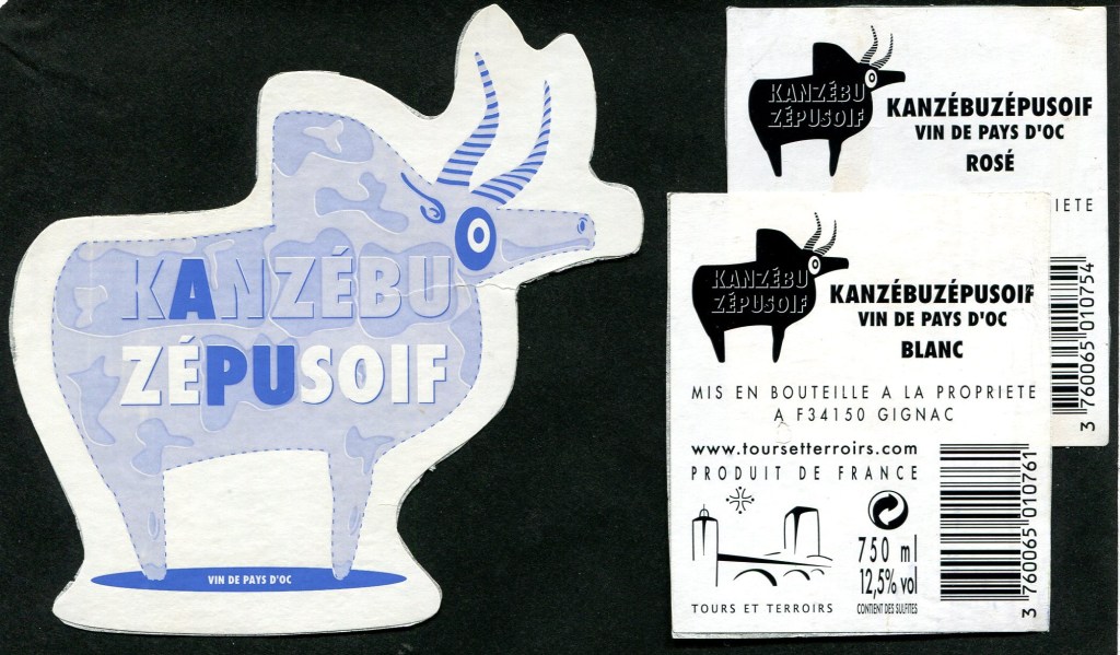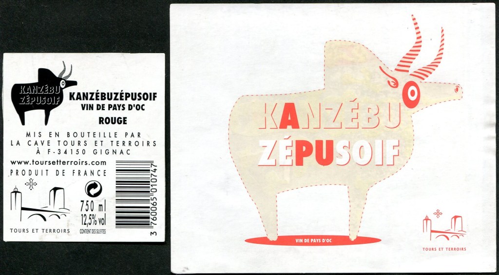 Proposée en mai 2016, déclinée en blanc, rosé, ou rouge, cette cuvée arborait une superbe étiquette thermosensible montrant un Zébu stylisé avec deux lignes d’un court texte : KANZEBUZEPUSOIF. Quand la bouteille était pleine, les mots visibles étaient « ZÉ SOIF », quand la bouteille était à moitié vide, le seul mot apparent était « ZÉBU », et quand elle était vide, à température ambiante, apparaissait la mention évidente « A PU ». Magistral, non ? On doit cette idée à Chloé Alquier, alors déléguée commerciale à la cave de Gignac, devenue cave Tours et Terroirs après la fusion avec deux autres coopératives locales. La réalisation technique de cette merveille est due à l’imprimerie XXX de Montpellier.