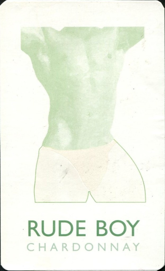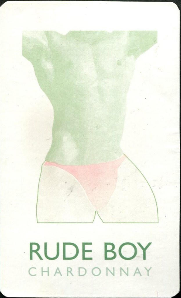 Lorsque la bouteille de chardonnay RUDE BOY fut rapportée en France, sortie du frigo, et vidée, que croyez-vous qu’il apparut sous le joli slip rose ? Eh bien, grosse déception : RIEN. Le malheureux calbute de l’éphèbe était simplement devenu blanc, toujours opaque ! Et, phénomènes étranges, l’éphèbe avait perdu ses cuisses, réduit à un homme-tronc, tandis que la typographie de l’étiquette avait gagné en netteté…