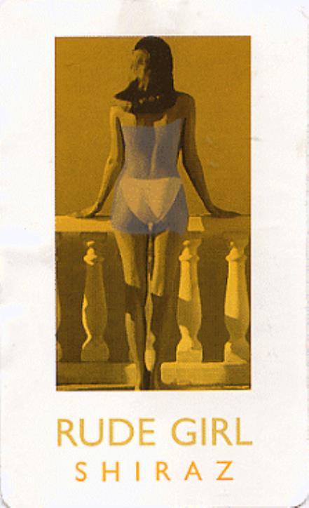 Parité oblige, il existait aussi une étiquette de « RUDE GIRL », dont l’effet visuel était beaucoup plus réussi, bien que restant assez sage. Elle habillait un vin rouge de cépage Shiraz, et montrait une jeune femme de dos, appuyée sur une luxueuse rambarde face à ce qu’on peut imaginer être la mer. A bonne température, la robe de la dame disparaissait, laissant voir … une petite culotte blanche ! Cette étiquette est consultable de façon dynamique sur le joli site de Peter F. MAY « Unusual Wines. Diversity in Wine » , qui présente des vins inhabituels, soit par leur nature, leur provenance, ou leur étiquetage (et que je remercie ici).
