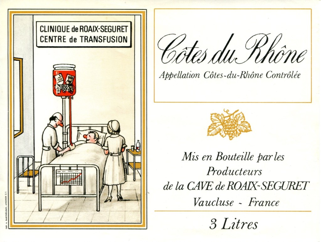 La symbolique du vin sauveur, substitut de la force vitale du sang, se retrouve dans cette étiquette humoristique, qui illustre l’en-tête de cet article :