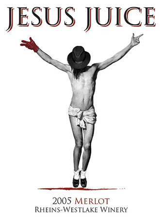 De la symbolique au mauvais gout, certains n’hésitent pas à franchir le pas, comme en témoigne cette cuvée de Merlot « Jesus Juice » des USA. Ce terme peut paraitre offensant, mais il désignerait en argot le vin de l’eucharistie…