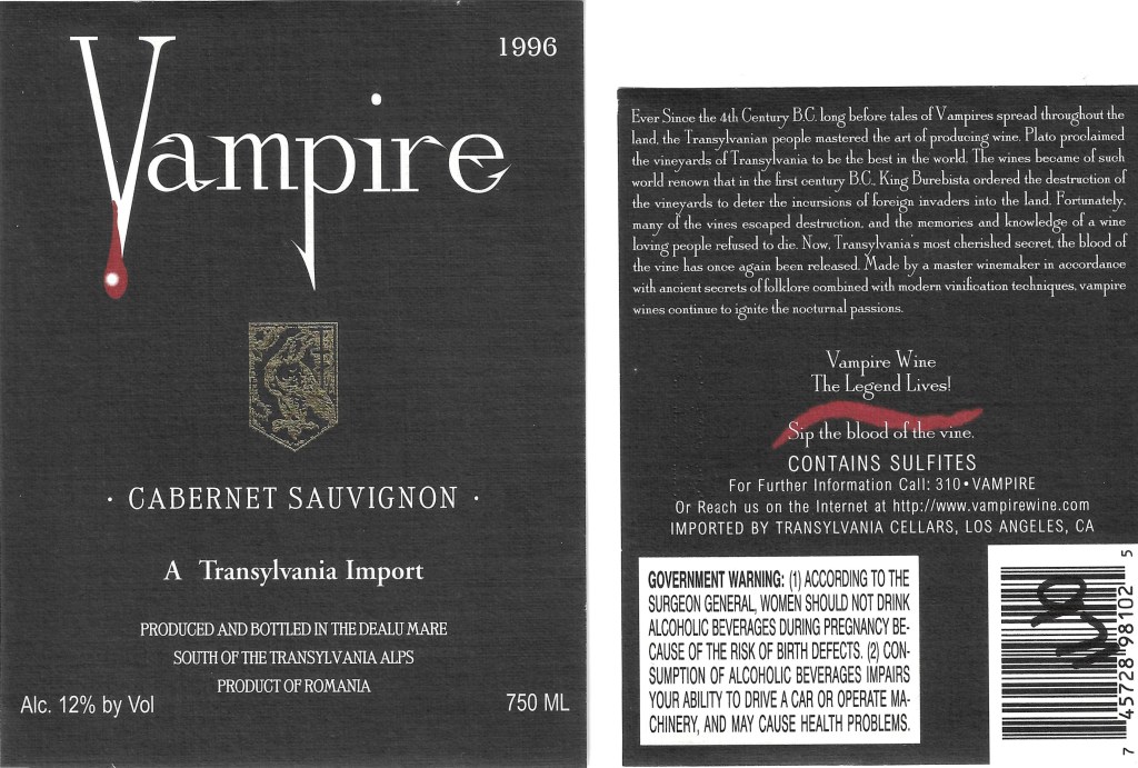C’est ainsi qu’en 1992, à la faveur conjointe de la sortie du film « Dracula » de Francis Ford Coppola et de l’ouverture au monde des vins des ex-pays de l’Est, des bouteilles provenant de la Transylvanie roumaine se sont vendues fort cher dans les boutiques européennes ou nord-américaines sous des habillages accrocheurs tels que ce « Château Dracula » (avec cape de soie rouge autour de la bouteille !), ou cette cuvée « Vampire »  dont la contre étiquette  enfonce le clou (sans jeu de mot..) :