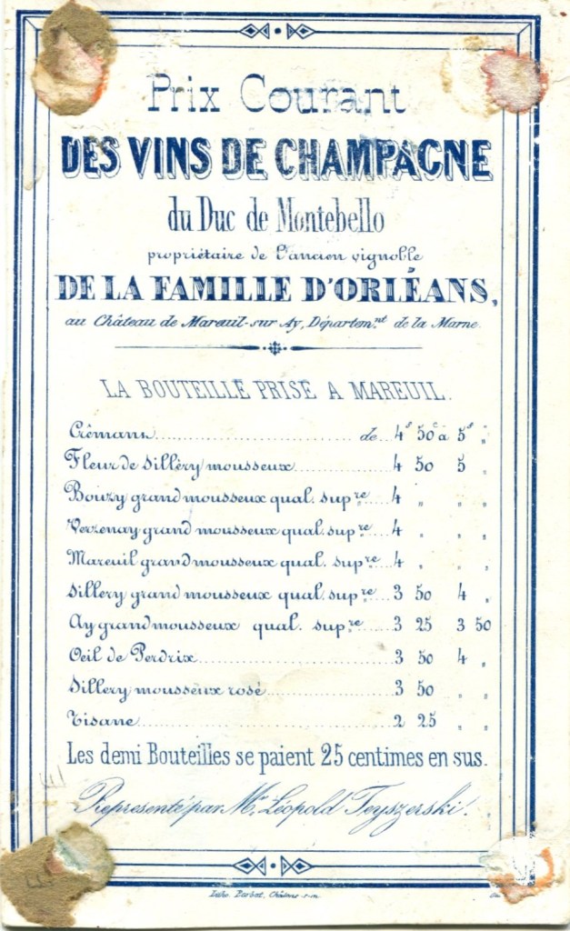 Un tarif de la maison Duc de Montebello des années 1840-50 nous précise l’échelle des prix des différentes cuvées : la tisane était effectivement le champagne le meilleur marché, proposé à 2 francs 25, soit deux fois moins que les cuvées les plus prestigieuses (fleur de Sillery mousseux à 4 francs, Crémant à 4f 50).
