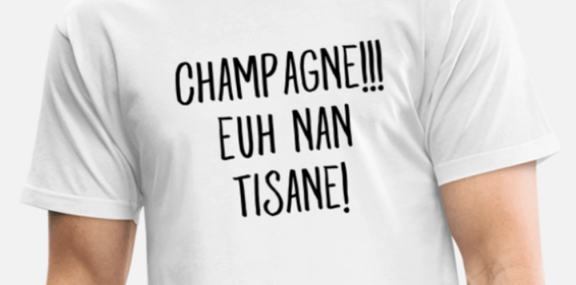 Alors, convaincu(e) ? Contrairement à ce que veut nous faire croire cette publicité récente pour T-shirt humoristique, Tisane et Champagne n’ont jamais été opposés !