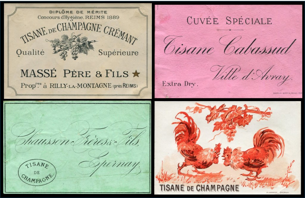 Les grandes maisons de Champagne, parmi lesquelles Besserat, Bollinger, de Venoge, Massé, Moët, Montebello, Mumm, Joseph Perrier, Roederer, ont commercialisé leur tisane jusqu’au début du XXe siècle.