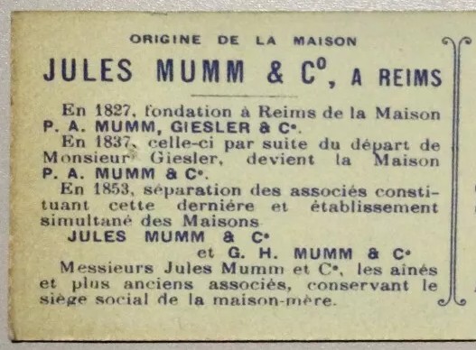 - Jules Mumm & Co par Jules Mumm (1809-1863), fils de Jacobus.