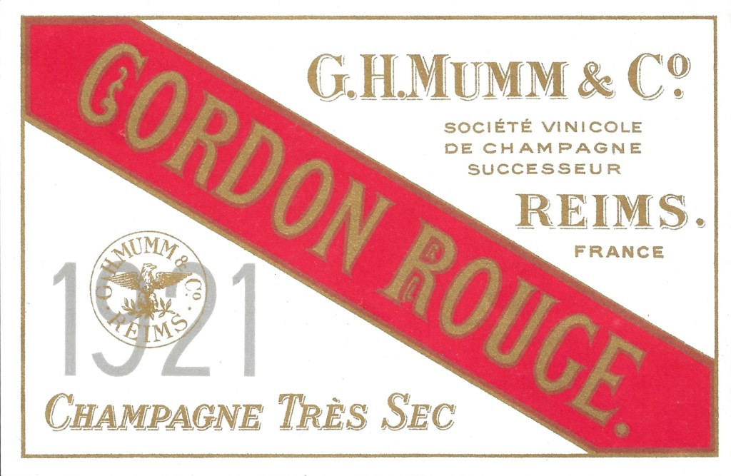 C’est ensuite l’ascension phénoménale de la maison G. H. Mumm & C° jusqu’à la première guerre mondiale ; sa confiscation par la France en 1914 (Georges Hermann Mumm étant resté allemand, bien qu’il ait déposé en 1876 l’habillage au fameux cordon rouge en hommage à la légion d’honneur française) ; la vente aux enchères en 1920 à la Société Vinicole de Champagne ; la reprise par le fils de Georges Hermann au nom du 3ème Reich de 1940 à 1945 ; puis une nouvelle « francisation » de la société, qui s’est appelée à partir de 1946 « G. H. Mumm & C°, Société Vinicole de Champagne, Successeurs », nom que l’on peut voir sur les étiquettes de l’époque jusqu’au rachat par Seagram en 1985 ; puis les reventes successives à d’autres groupes internationaux de vins et spiritueux [1, 2].