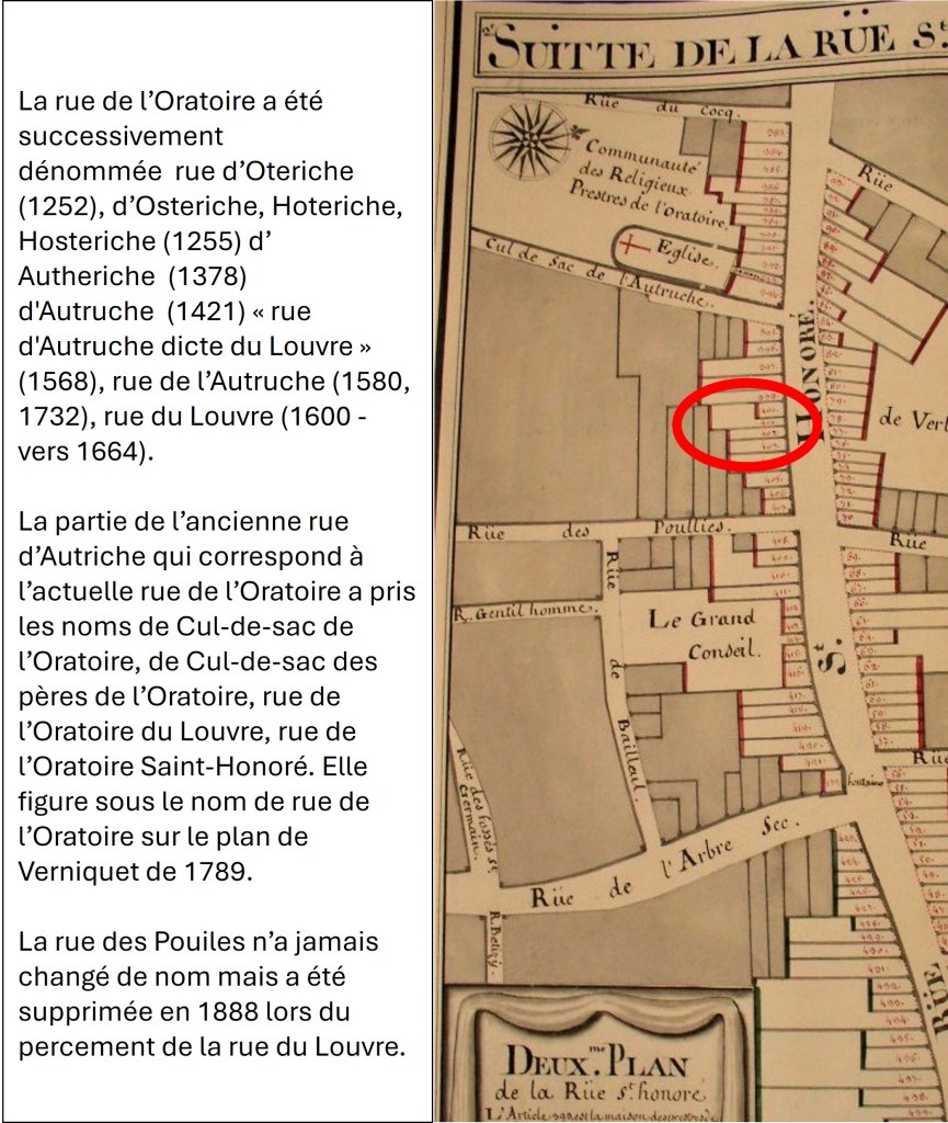 « Il y avait plus bas encore, dans notre rue, deux ou trois magasins de comestibles ; un seul a survécu, c’est l’hôtel des Américains, dénomination prise en 1765 ». Cette date est confirmée par une publicité bien plus récente, parue dans un journal de 1891 « Hôtel des Américains, 139 rue Saint-Honoré, Paris. Maison fondée en 1765 par Menier » [5], mais pas par la liste des propriétaires établie entre 1766 et 1700 dans le Papier terrier du Roy de la ville de Paris pour le n° 400 de la rue Saint Honoré ou les bâtiments voisins [6] (voir plan ci-dessous ; l’emplacement de l’Hôtel des Américains est entouré de rouge, entre la rue des Poulies et la rue bordant l’église des pères de l’Oratoire, future rue de l’Oratoire nommée à cette période « rue du cul de sac de l’Autruche » !