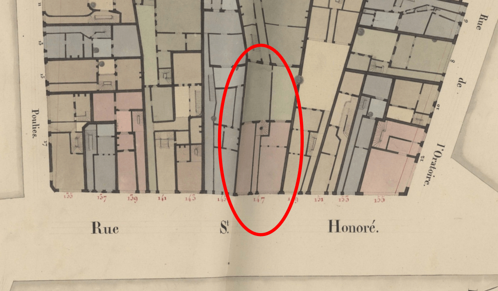 Emplacement de l’Hôtel des Américains, au 147 et 147bis de la rue St Honoré en 1806. Plan : Cadastre de Paris par îlot (1810-1836), rue Saint-Honoré, ilot 12. Archives de Paris https://archives.paris.fr/f/planspacellaires/tableau/?&crit1=12&v_12_1=Saint-Honor%E9+%28rue+%29