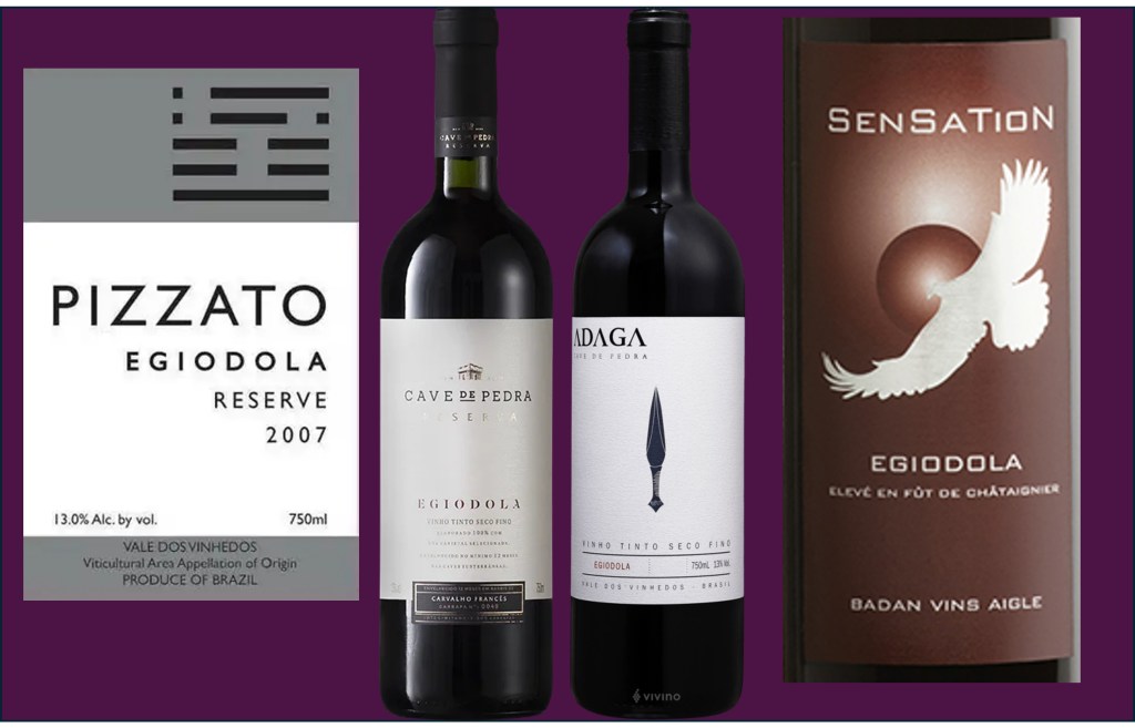 - L’Egiodola est cultivé à 100-700 m d’altitude dans les vignobles de la Serra Gaúcha, sud du Brésil. Domaines Pizzato vinhos, https://loja.pizzato.net/produto/vinhos-tintos/vinho-seco/pizzato-egiodola-reserva-1?srsltid=AfmBOootdliKz2za_52sjNQRU5R59RcBdaY7y2_B7TYP-9XItrp-fAzf ;