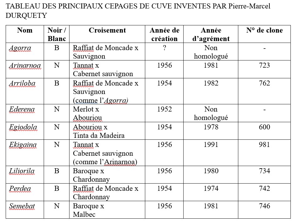 Pierre Marcel Durquety (1923-2016) est un ingénieur agronome issu de l’Ecole Nationale Supérieure d’Agronomie (aujourd’hui institut agronomique) de Montpellier. Chercheur à l’INRA de Bordeaux , à la station du Sud-Ouest basée dans le domaine de la Grande Ferrade [3], il a fait de nombreuses recherches sur les maladies de la vigne et sur la création de nouveaux cépages. Entre 1950 et 1980, il a testé de multiples croisements intraspécifiques (c’est-à-dire deux variétés d’une plante d’une même espèce, en l’occurrence vitis vinifera). Parmi eux, l’Egiodola créé en 1954 et les cépages aux noms « basques », détaillés dans le tableau suivant.