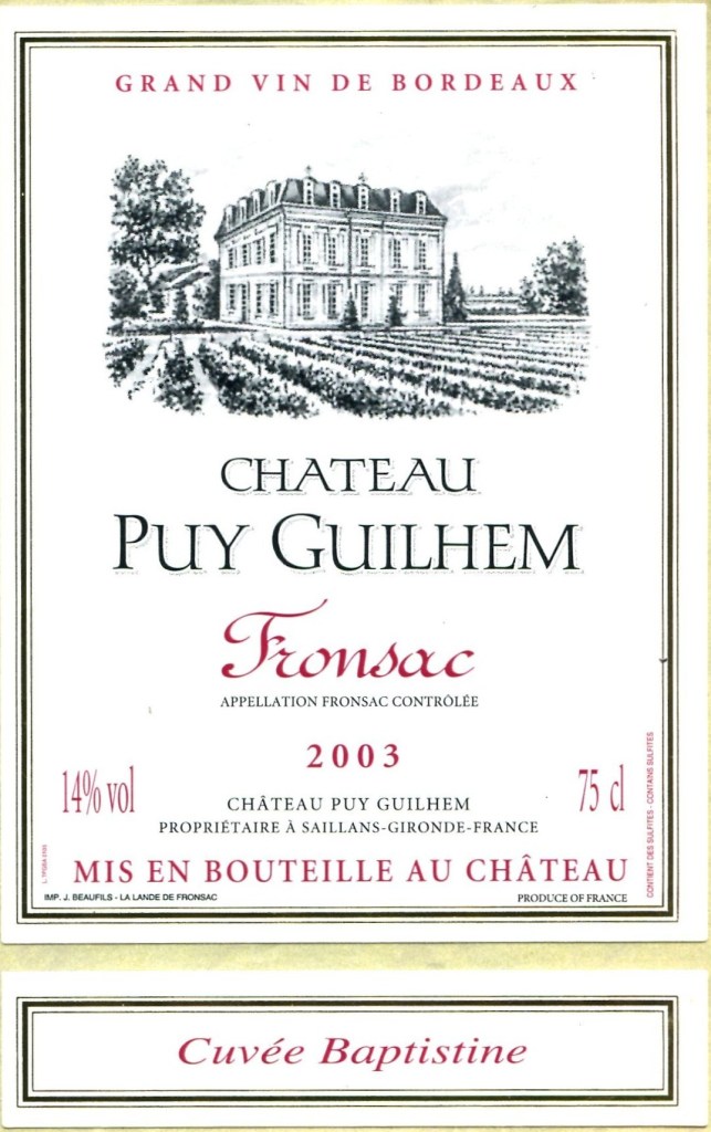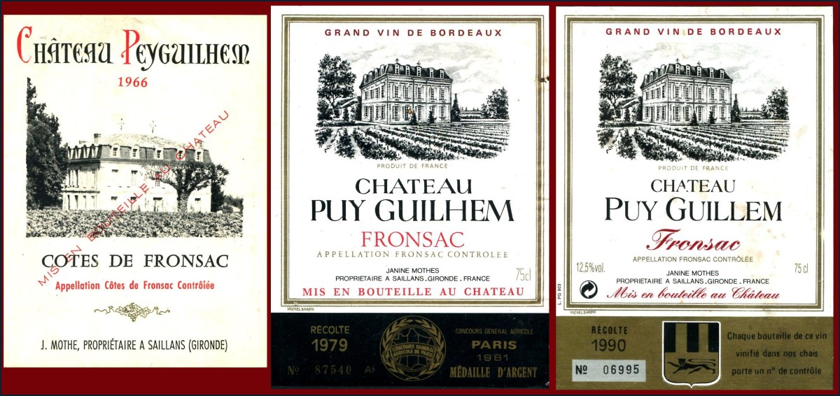 Trois étiquettes, un même domaine [1], mais trois versions pour le nom du château (Peyguillem, Puy Guilhem, Puy Guillem) et deux AOC différentes (Fronsac et Côtes de Fronsac). Même l’orthographe de la propriétaire fluctue. Il n’y a pas qu’en Bourgogne que les orthographes des noms de vignobles varient.