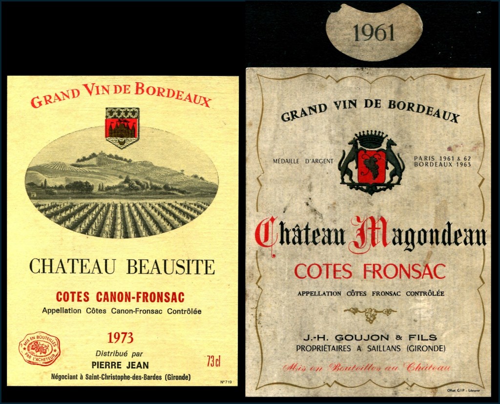 Il ne s’agit pas de deux appellations différentes, mais de l’évolution d’une même appellation. Dans les décrets de 1937 et 1939 qui ont créé les deux AOC du Fronsadais, les dénominations officielles étaient « Côtes de Fronsac » et « Côtes de Canon-Fronsac » [4]. Les noms des deux AOC ont été simplifiés en « Fronsac » et « Canon-Fronsac » par décret en 1976 et 1964 [5, 6]. La quasi-totalité des étiquettes portant les AOC « Côtes de Fronsac » et « Côtes de Canon-Fronsac » sont donc antérieures à 1976, rien d’anormal à cela.