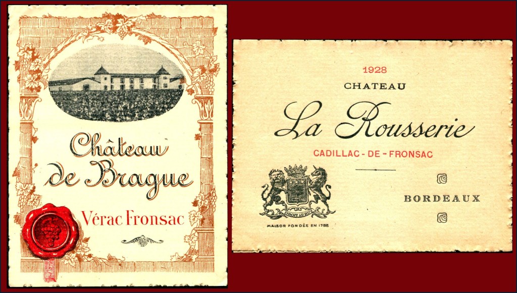 Ces deux étiquettes anciennes mentionnent le nom de Fronsac mais leur châteaux ne sont pas dans l’aire d’appellation définie en 1937 et 1939. Le Château de Brague produit toujours du vin en AOC Bordeaux Supérieur. Le Domaine de La Rousserie semble avoir cessé toute activité vinicole et a été transformé en un lieu de réception et mariages…