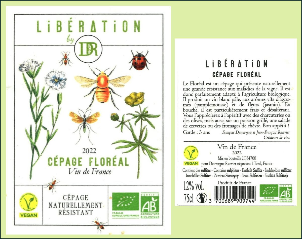 Cette cuvée Libération de la maison de négoce de François Dauvergne et Jean-François Ranvier (D & R) est issue du cépage « Floréal« . Floréal, nom charmant qui pourrait renvoyer au 8ème mois du calendrier républicain utilisé durant la Révolution française (20-21 avril ~ 19-20 mai – période de l’épanouissement des fleurs). Mais ici, Floreal signe une autre révolution, en cours celle-ci. Celle de la commercialisation dans la grande distribution de vins issus de nouveaux cépages hybrides dits « résistants ».