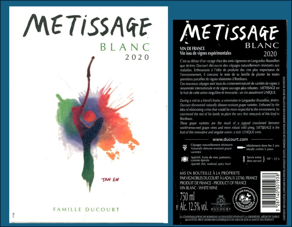 La famille Ducourt, propriétaire dans le Bordelais, s’intéresse aux cépages hybrides résistants. Elle commercialise la cuvée Métissage, en rouge et en blanc sec ou moelleux. Mais aucune indication des cépages utilisés, hélas.
