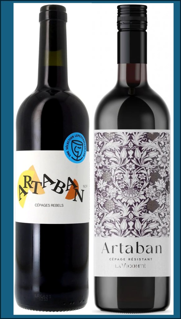 Mickaël Raynal, du Domaine de Revel à Vaïssac (Tarn-et-Garonne), dont nous avions déjà parlé dans un article précédent [8], n’est pas mécontent de l’Artaban, dont il vinifie une cuvée Grain de Rebel Artaban (85% Artaban et 15% Caladoc, photo). Dès son installation, il a planté du Muscaris, du Souvignier gris et du Solaris, et secondairement du Vidoc, du cabernet cortis et l’Artaban. Trois de ses cuvées sont en monocépage (Muscaris, Souvignier gris et Solaris), les autres associent 85 % d’un cépage résistant et 15 % d’un cépage oublié. Lui aussi souligne, dans un article qui lui est consacré dans le site Vitisphère [9], les difficultés à faire adopter les vins issus d’hybrides résistants : « Au départ, j’ai gardé des cépages classiques pour que les consommateurs puissent se raccrocher à quelque chose de connu et qu’ils acceptent de goûter mes vins. Il fallait beaucoup expliquer les cépages résistants. C’est moins le cas à présent. Ils commencent à être plus connus, mais il reste encore un gros travail de pédagogie ».
