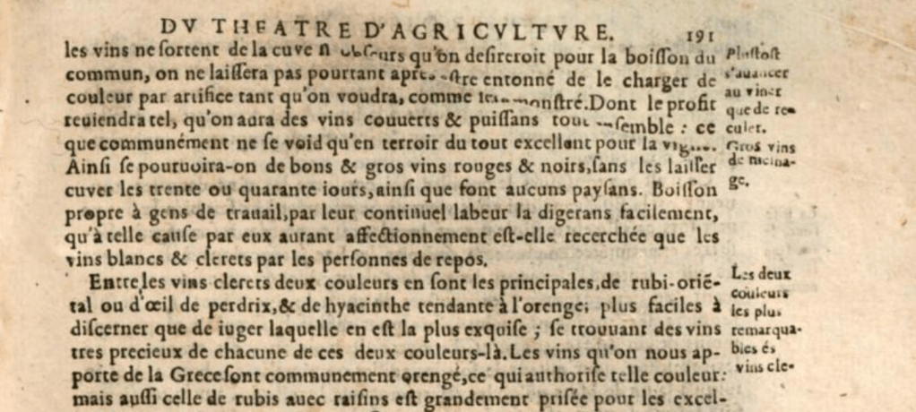 L’ambiguïté pour désigner la couleur un vin « œil de perdrix » se retrouve dans l’ouvrage d’Olivier de Serres « Le Théâtre d’agriculture et mesnage des champs » publié en 1600. La couleur « œil de perdrix » est citée comme l’une des « deux couleurs les plus remarquables des vins clerets » mais se voit attribuer une nuance « rubi-oriétal », qui l’oppose à la teinte « hyacinte tendante à l’orenge » des autres clerets (voir l’extrait ci-dessous, début du 2ème chapitre). Pas simple de s’y retrouver …