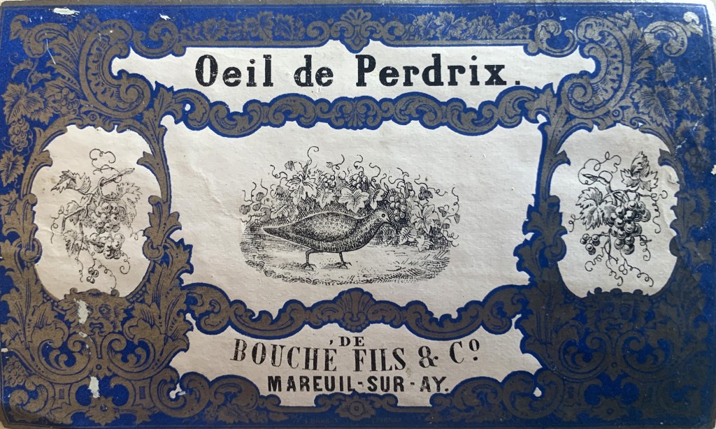 Quelques étiquettes nous prouvent que la tradition des cuvées œil de perdrix est au moins aussi ancienne en Champagne qu’à Neuchâtel, et qu’elle persiste également de nos jours, bien que confidentielle. L’ancienneté, antérieure à 1850, est attestée par cette étiquette d’œil de perdrix 1834 de la maison Renaudin Bollinger à Aÿ (actuelle maison de Champagne Bollinger).