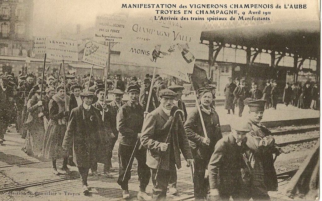 En Champagne, le XXème siècle a débuté par de graves conflits [1] occasionnés par la délimitation de la zone d’appellation « Champagne ». Un premier conflit, violent, oppose en 1910 les vignerons de la Marne aux négociants, qui importent à bas prix des vins d’autres régions qu’ils « champagnisent » et vendent sous étiquette authentique. Des maisons de négociants sont saccagées, des barricades s’érigent, l’armée intervient. Les vignerons marnais obtiennent une délimitation des vignobles, mais qui va entraîner par ricochet une autre révolte, celle des vignerons aubois… Dès décembre 1908, un décret de délimitation exclut l’Aube des zones d’appellation Champagne. Il est complété par une loi de finance votée le 06 février 1911, qui interdit aux vignerons aubois de vendre leur raisin à la Marne pour la fabrication du champagne !